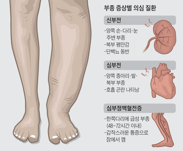 2. ๋ถ€์ข…(์†๋ฐœ, ๋ฐœ๋ชฉ, ์–ผ๊ตด ํŠนํžˆ ์•„์นจ์— ๋ˆˆ ์ฃผ๋ณ€ ๋ถ“๊ธฐ ๋“ฑ) → ์‹ ์žฅ์ด ์ˆ˜๋ถ„·์—ผ๋ถ„์„ ์ œ๋Œ€๋กœ ๋ฐฐ์ถœํ•˜์ง€ ๋ชปํ•ด ์ฒด๋‚ด์— ์ •์ฒด๋  ๊ฒฝ์šฐ. National Kidney Foundation+1