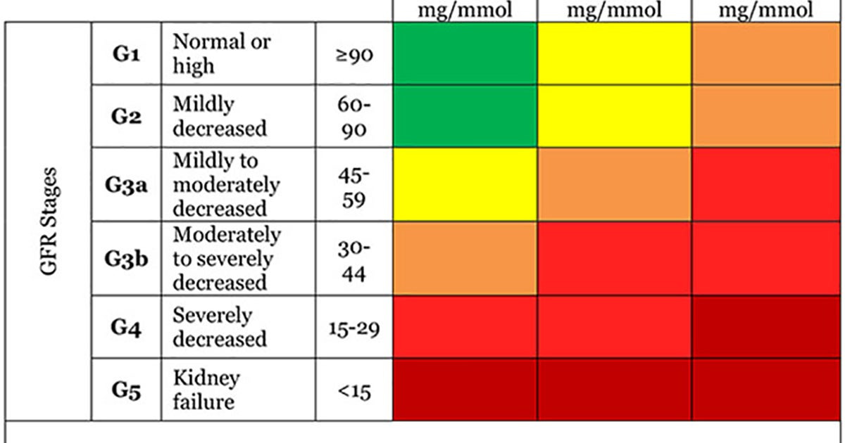 | ์์๋ถ๋ฏผ-ํฌ๋ ์ํฐ๋๋น(uACR, urine albumin-creatinine ratio) | ์๋ณ ๋ด ์๋ถ๋ฏผ(๋จ๋ฐฑ์ง) ๋์ถ์ ์ธก์ . ๋จ๋ฐฑ๋จ๋ ์ ์ฅ ์์์ ํ์. National Kidney Foundation | ์ ์: < 30 mg/g (๋๋ <30 mg/g ํฌ๋ ์ํฐ๋ ๋๋น) National Kidney Foundation+1 30-300 mg/g → ๋จ๋ฐฑ๋จ ์ฆ๊ฐ ๊ฐ๋ฅ์ฑ, 300 mg/g ์ด์ → ์ฌํ ๋์ถ ๊ฐ๋ฅ์ฑ American Kidney Fund+1 |