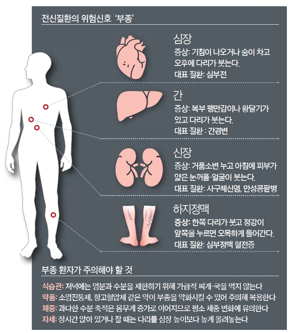 - ๋ถ์ข (์๋ฐ, ๋ฐ๋ชฉ, ์ผ๊ตด ํนํ ์์นจ์ ๋ ์ฃผ๋ณ ๋ถ๊ธฐ ๋ฑ) → ์ ์ฅ์ด ์๋ถ·์ผ๋ถ์ ์ ๋๋ก ๋ฐฐ์ถํ์ง ๋ชปํด ์ฒด๋ด์ ์ ์ฒด๋ ๊ฒฝ์ฐ. National Kidney Foundation+1